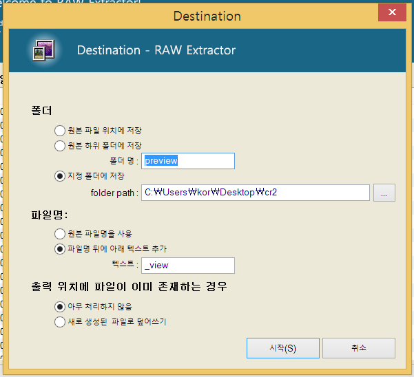파일명 뒤에 아래 텍스트 추가, 출력 위치에 파일이 이미 존재하는 경우 아무 처리하지 않음 체크 하고