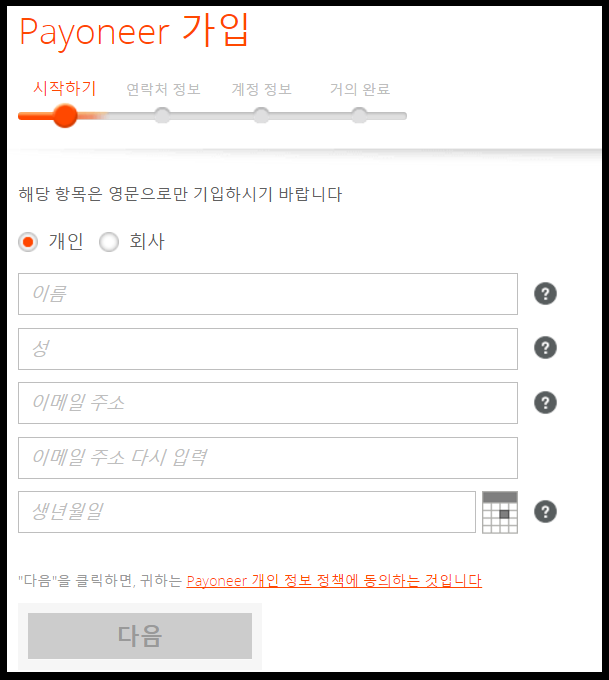 그럼 지금부터 PAYONEER 해외계좌 개설 시작해볼까요?