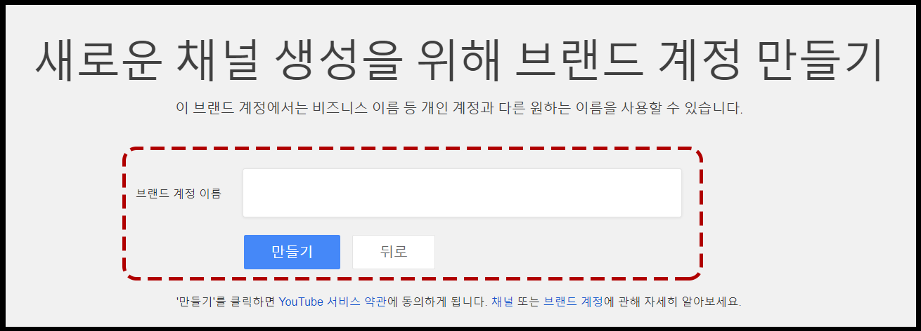 ' 만들기 ' 를 클릭하면 YouTube 서비스 약관에 동의하게 됩니다.