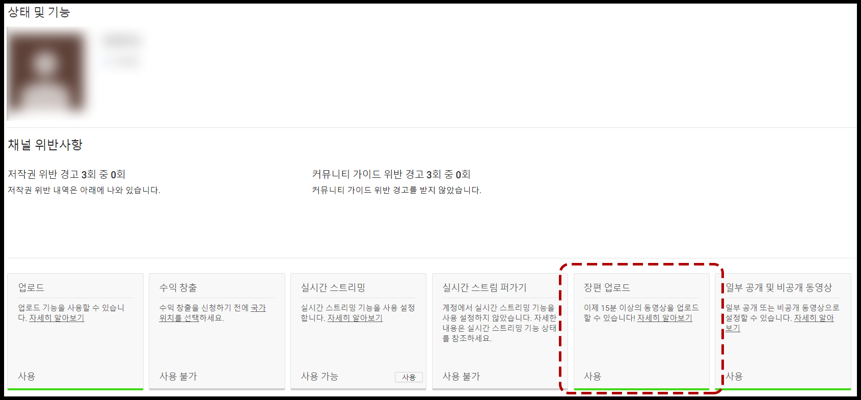 장편 업로드 사용 설정이 되어 있으며