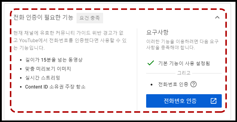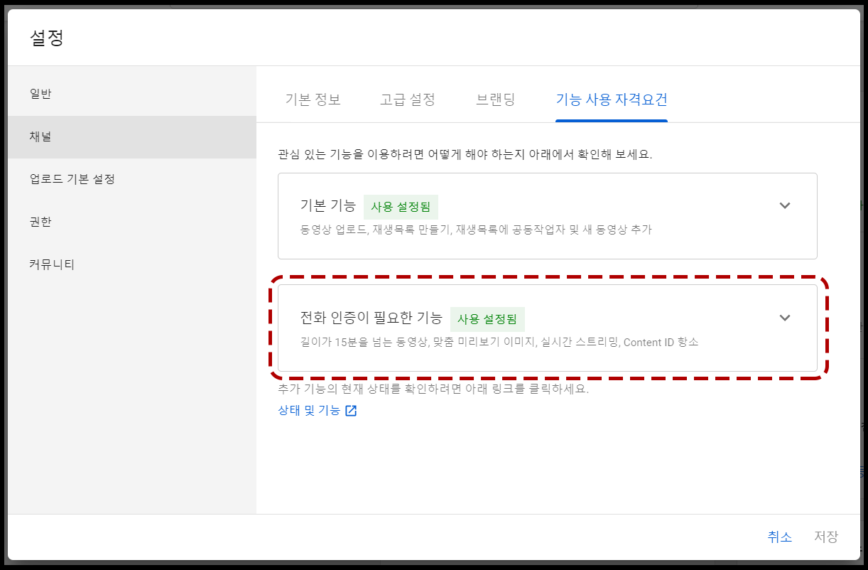 처음의 유튜브 스튜디오 > 설정 > 채널 > 기능 사용 자격요건 부분에도