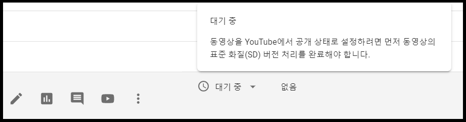 동영상을 YouTube에서 공개 상태로 설정하려면 먼저 동영상의 표준 화질(SD) 버전 처리를 완료해야 합니다.