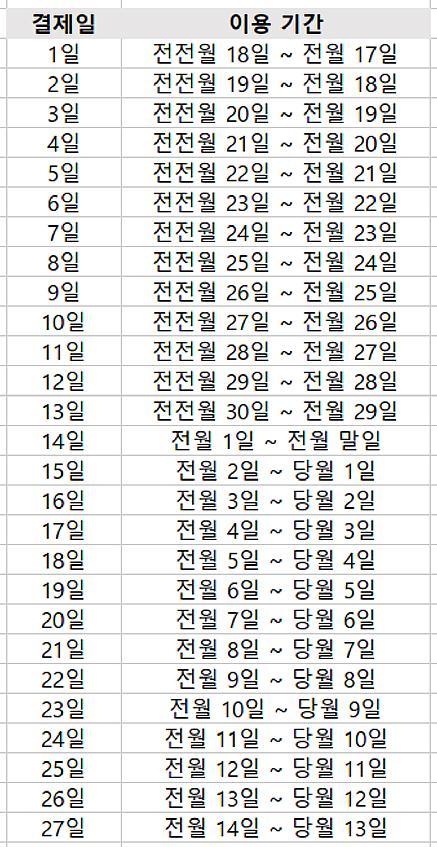 주 사용 카드인 국민카드의 결제일별 이용기간을 정리해봤습니다
