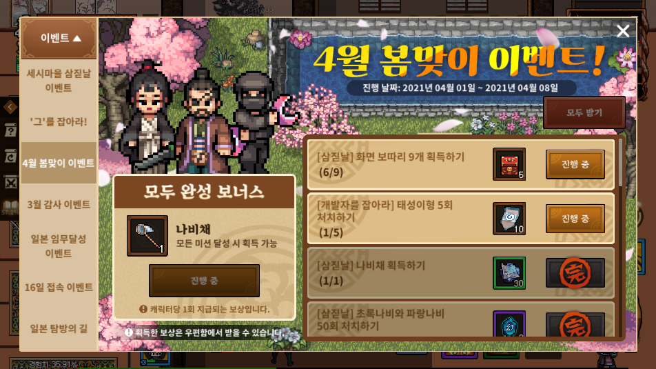 4월 봄맞이 이벤트를 확인해보니 ' 새싹 핀 ' 획득하기는 완료되었는데