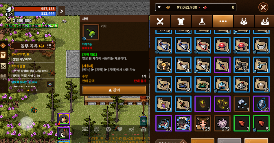 풀잎1개, 10만 금덩어리, 성장 촉진 시약 (6시간) 2개인데,