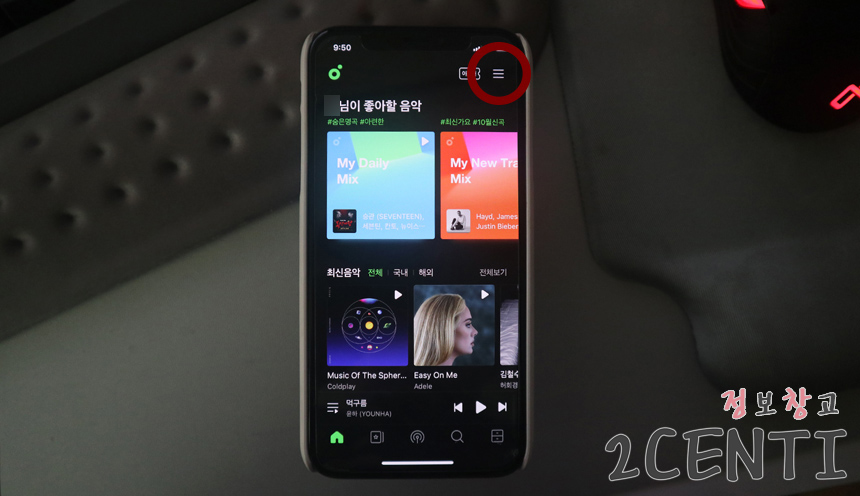 멜론 어플을 들어가신 후, 우측 상단에 있는 메뉴바를 눌러주세요