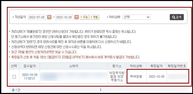 그럼 요렇게 확정일자 처리상태 ' 부여 완료 ' 로 마무리!
