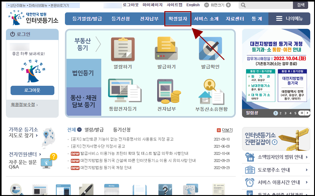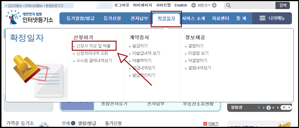 상단 카테고리 중 ' 확정일자 ' 에 마우스를 갖다대주세요
