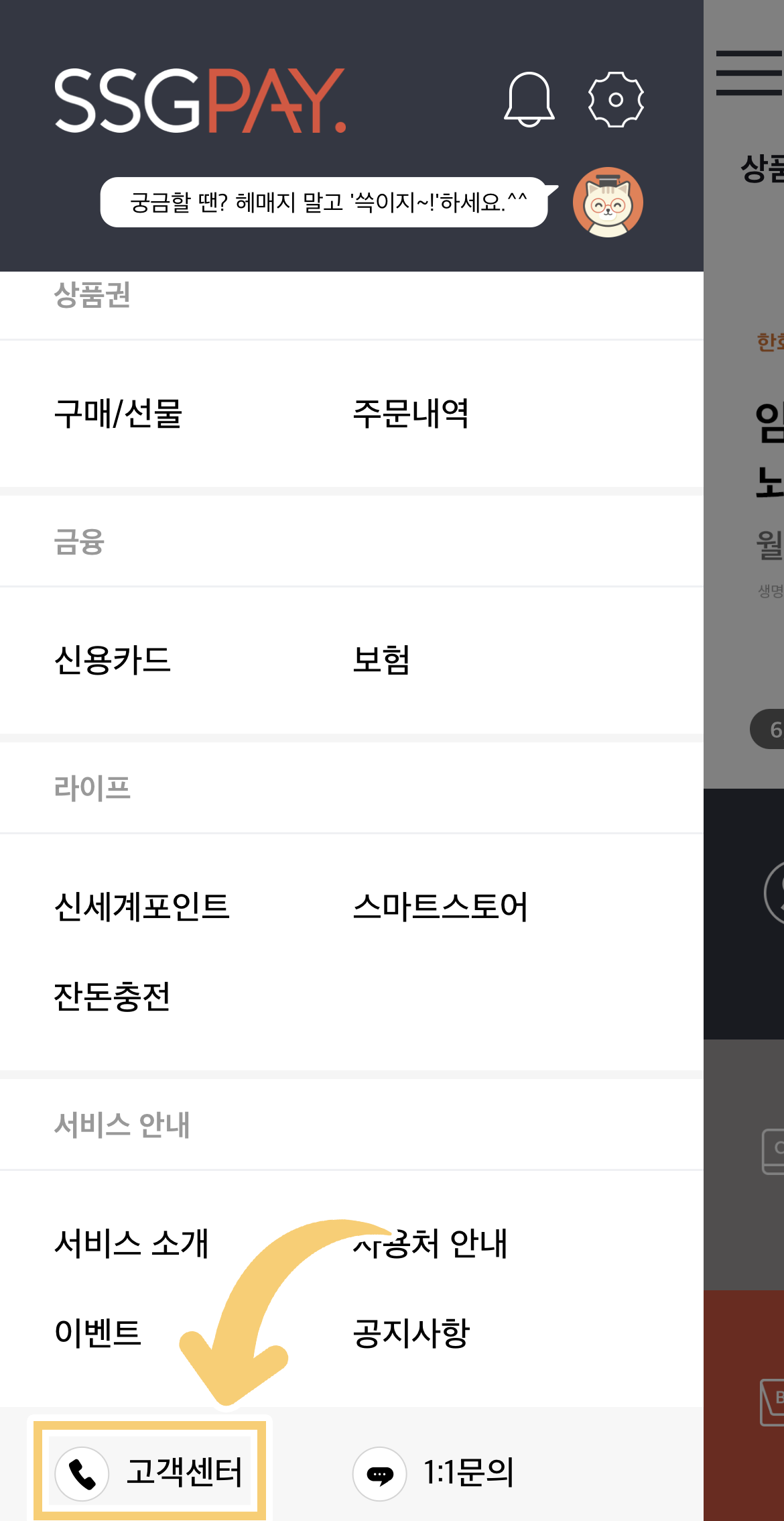 하단의 ' 고객센터 ' 화면으로 들어가면