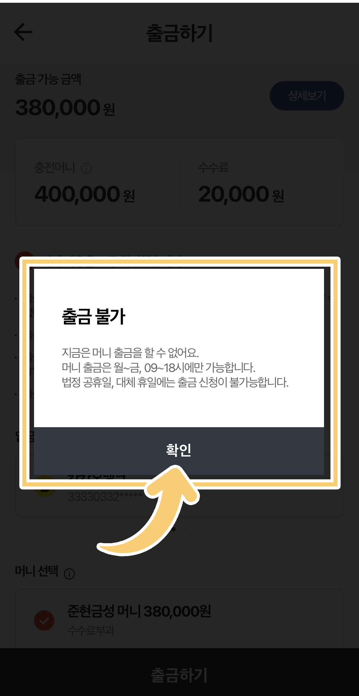 출금불가 팝업이 뜬다면 내용 확인해주세요~