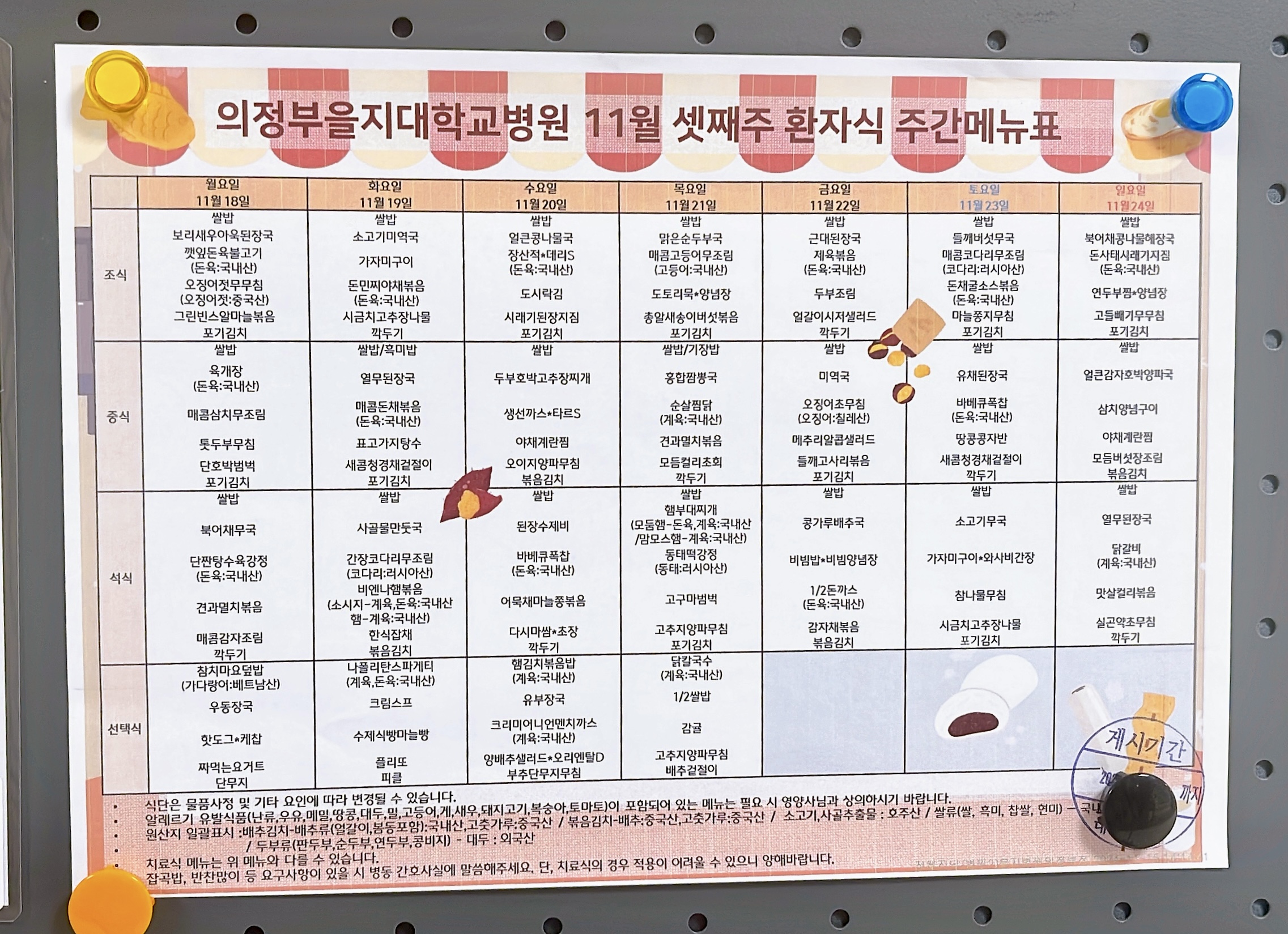 주간 메뉴표 등은 매주 변동되겠지만